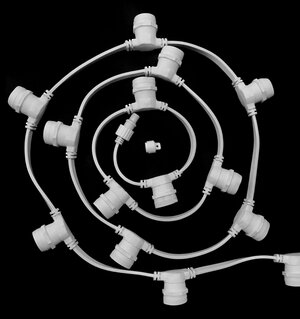 Световое оформление улиц – это БЕЛТЛАЙТ. Гирлянда с патронами Е27 – для обычных лампочек. Лампочки могут быть светодиодными или обычными. Наиболее красиво выглядит комбинация обычных и строб ламп.