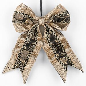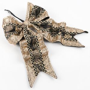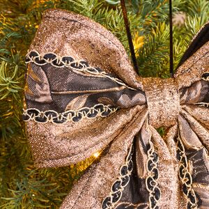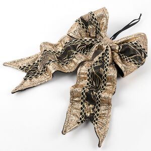 Забившись в глубину еловой кроны, новогодний бант старательно маскируется ветками и надеется, что Золушка пробежит со своим утюгом мимо. Этой аккуратистке невозможно объяснить, что именно мягкие складки делают бант елочным украшением №1 (и никто не разубедит Nuit Doree, что это не так), заставляя золотые блики плясать на его лентах! Жаль, шансов затеряться среди хвои у сияющего франта маловато.