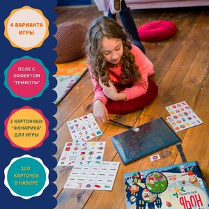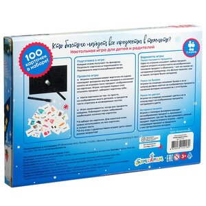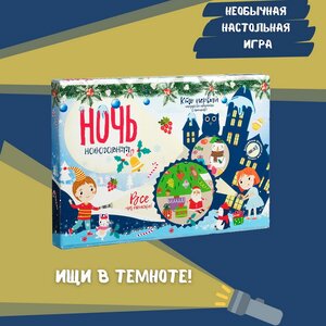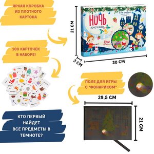 Новогодняя ночь - незабываемое время, полное радости, веселых приключений и чудес. Сделать долгожданный праздник еще волшебнее поможет развивающая настольная игра, предназначающаяся для двух игроков от трех лет и старше. Она состоит из 100 карточек с предметами, необычного игрового поля с эффектном темноты и двух картонных фонариков. Поиск сюрпризов, всех круглых или красных предметов в нарисованной комнате и все это в полной темноте - эта новогодняя настольная игра точно сможет удивить вас и подарить фейерверк ярких эмоций!