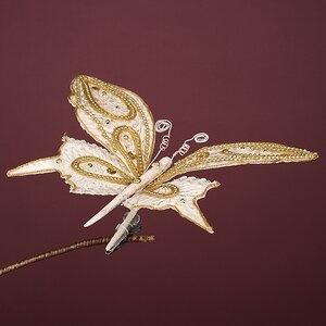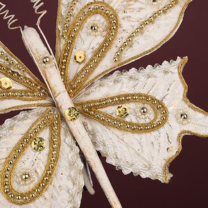 Бабочка Celona - елочная игрушка на прищепке, которая изумительно смотрится как на елочной ветке, так и в новогодних букетах и композициях. Несмотря на легкость и изящество, присущие бабочкам, она не похожа на своих летних пестрых сестричек: крылья цвета слоновой кости, серебряный и золотой декор делают ее подходящим украшением, идеально вписывающимся в стилистику зимнего торжества!