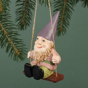 Больше всего на свете этот гномик любит кататься на качелях! Они установлены прямо в лесу и все свободное время волшебный персонаж проводит именно там. Эта елочная подвеска ассоциируется с легкостью, воздушностью и настоящей сказкой. С ней праздничная атмосфера в вашем доме станете еще чудеснее.