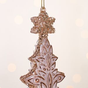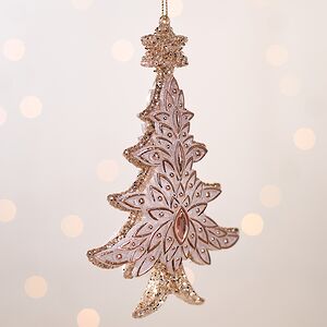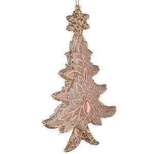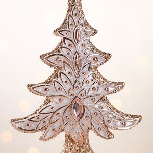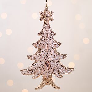 Такая новогодняя игрушка станет интересным украшением в наряде праздничной елочки. Миниатюрное деревце выполнено в розовом оттенке и обрамлено элегантным золотистым контуром. Его крона состоит из нескольких заметных аккуратных ярусов, благодаря чему подвеска выглядит особенно изящно. Дополняет интересный образ снежинка на вытянутой макушке. Повесьте игрушку на елку, и праздничная атмосфера не заставить себя ждать!