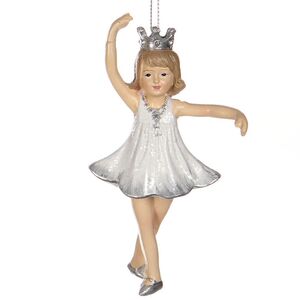 Каждая юная леди имеет свой особый талант. Эта маленькая принцесса, придерживающая короткое платьице, разучила несколько превосходных балетных партий. Она уже приняла позу и готова начать свои плавные движения, как только зазвучит волшебная музыка. Маленькая балерина сыграет роль восхитительно нежного новогоднего елочного украшения.
