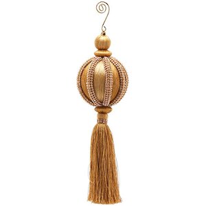 Красавица-елочка тоже любит модные украшения! И можете не сомневаться, что такая новогодняя игрушка, представляющая собой оригинальный темно-золотистый шарик с кисточкой и эффектным декором, точно ей понравится. Эта подвеска словно иллюстрирует собой роскошь и богатство востока: кажется, что ее оценил бы даже самый взыскательный и требовательный султан. Изящные ниточки, которые не только искусно переплетены между собой в самом низу игрушки, но и являющиеся основой самого шара, богатые украшения, соединенные в чарующий узор, множество страз и в завершении - оригинальная золотистая петелька. Такая елочная подвеска изумительно впишется в праздничный декор вашего дома, причем великолепно она будет смотреться не только на пушистой лесной красавице, но и на предметах мебели, венках или другой атрибутике торжества.