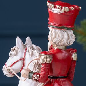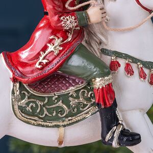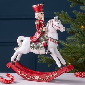 Гордо восседающий на коне Щелкунчик похож на генерала, что ведет новогодние фигурки Winter Deco на парад. Вот сейчас натянет удила, поднимая скакуна на дыбы, и даст команду запускать в небо многоцветный салют!.. Хотя нет, узорчатые полозья помешают. Так что можете не волноваться за полировку и паркет, ставя под елку, на окно или на стол фигурку, в красном мундире с золотыми эполетами: герой будет вести себя примерно.