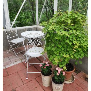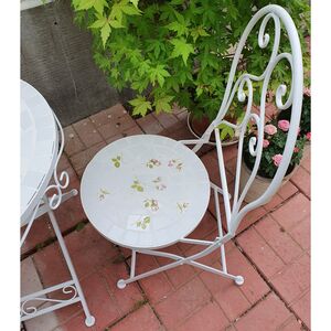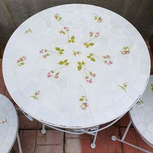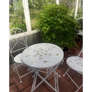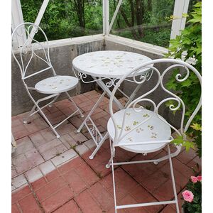 Изящество, визуальная легкость и элегантность отличают этот комплект садовой мебели. Голландские мастера со вкусом подошли к его дизайну и создали настоящее произведение искусства. Круглый кованый столик и складные стулья выполнены из металла благородного белого оттенка и искусно декорированы роскошной мозаикой с нежными розами. Такое поразительное сочетание практичности и сдержанного изыска гармонично впишется как в обстановку садового участка, так и в домашний интерьер.