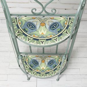 Легкая металлическая этажерка покорит сердца даже самых искушенных садоводов. Ее стройный силуэт напоминает замысловатый вензель, выписанный чьей-то легкой рукой. Эффектная мозаика дарит визуальное и тактильное наслаждение: изукрашенные яркими цветами полки приятно рассматривать и трогать. Этажерка для цветов компактна, но удивительно вместительна, а точеные ножки обладают отменной устойчивостью. Ривьера бережно сохранит все, что вы ей доверите, добавит вашему двору или жилищу немного утонченного французского шика и просто поднимет настроение.
