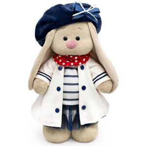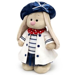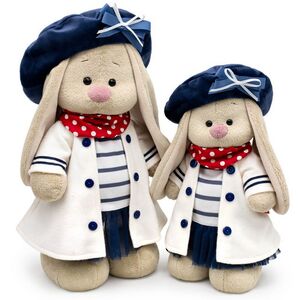 У Зайки Ми сегодня прекрасный день, ведь друзья пригласили ее покататься на яхте! По такому поводу нужен особый наряд и, конечно, наша малышка, героиня бренда Буди Баса, сразу же его подготовила. Элегантный костюмчик, выполненный в морском стиле, состоит из милого платьица с темно-синей сетчатой юбкой и полосатым верхом, а также легкого пальто молочного оттенка с контрастными пуговками и отделкой на рукавах. Образ дополняет роскошный берет кобальтового оттенка, дополненный изящным бантиком, и алый шейный платок в крупный белый горох.