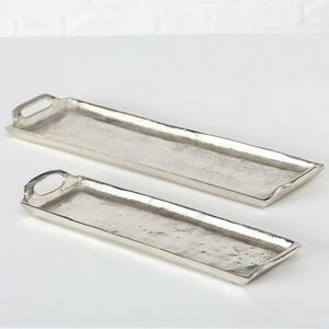 Вытянутые формы с низкими бортиками, серебристый цвет, аккуратные ручки для комфортного использования - металлические подносы Галант нельзя не заметить даже среди многочисленной посуды на столе! Набор подойдет не только для подачи закусок на стол, но и для украшения интерьера: минималистичные и изящные, они могут стать эффектными подставками для коллекции свечей, элементом оформления кухни и композиций.