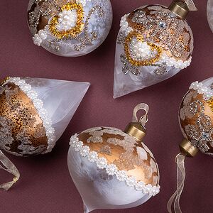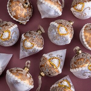 Желая выглядеть настоящими франтами, на елку шары Cuori Di Perle явились в шапочках цвета старого золота (немного винтажа ни одной новогодней игрушке не повредит), обшитых то ли морским жемчугом, то ли бусами из пластика, и с ажурными сердечками во лбу. Ни дать ни взять, январские Купидоны! Елочные шары с подвесками уже выстроились в очередь: ждут, когда братья достанут луки и начнут причинять всем любовь да счастье.