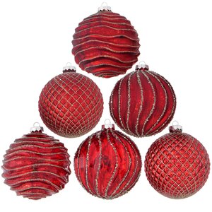 Пронзительно рубиновые бока, чьи рельефные узоры густо присыпаны блестками, будто сияющей звездной пылью, не дают отвести взгляд от этих стеклянных елочных шаров. Они поразительно напоминают сказочные плоды граната, сорванные в саду таинственной чародейки. Ее богатое воображение и волшебство одарили новогодние шары диковинными орнаментами, благодаря чему эти украшения смотрятся особенно шикарно. Выберите для них достойные места в убранстве вашей ели, и атмосфера в доме преисполнится отголосками кричащей роскоши.