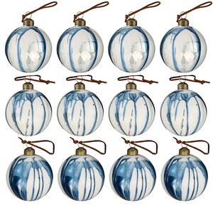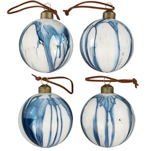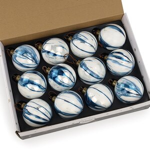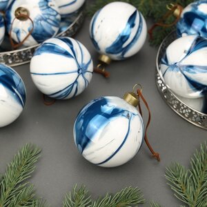 Marble Indigo - набор новогодних шаров из стекла, украшенный декором в виде изящных мазков в оттенке индиго. Кажется, сам Мороз поколдовал над созданием этой коллекции, иначе чем объяснить такое гармоничное сочетание белого и темно-синего цветов, воплощающее стилизацию ледяных просторов? Создайте эффектный зимний акцент, повесив стеклянные шары Marble Indigo на елку!