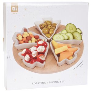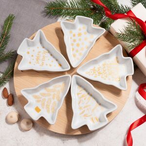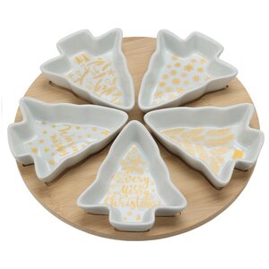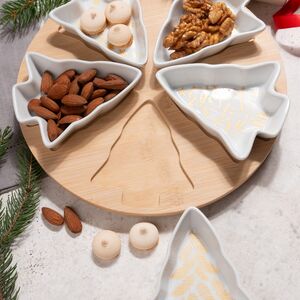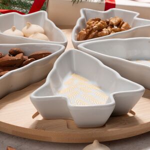 Эта менажница на крутящейся подставке вызовет у вас настоящий восторг! Она состоит из шести небольших пиал, предназначающихся для подачи самых разных закусок - сыров, орехов, солений, маслин, оливок и так далее. Каждая мини-тарелочка имеет оригинальную форму елочки и дивный золотистый принт, который чудесно сочетается с ее белоснежным оттенком. Благодаря тому, что эта менажница вращается, всем вашим домочадцам и гостям будет максимально комфортно находиться за праздничным столом.