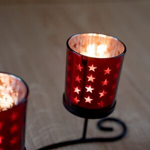 Блеск глянцевой поверхности в красных тонах гармонично соединился с гибкими линиями металлического основания. В результате такого сочетания получился подсвечник редкой красоты и изящества. Изделие придется по вкусу страстным и романтичным натурам, которые любят изысканные вещи, несущие в себе мистическое очарование.
