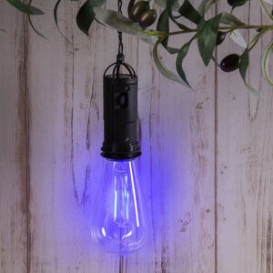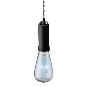 Solar Furiosa - светильник для сада, беседки, открытой веранды и других пространств вашего загородного участка. Форма обычной лампочки делает этот уличный светильник простым, и в то же время стильным аксессуаром: прозрачный плафон с горящим голубым диодом в сочетании с черным цоколем создает уютную ретро-обстановку. Черная цепочка удачно дополняет лампу и позволяет отрегулировать высоту подвеса.