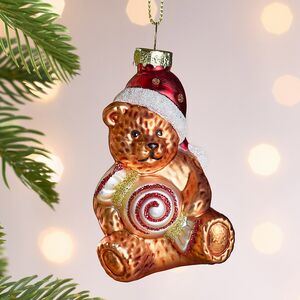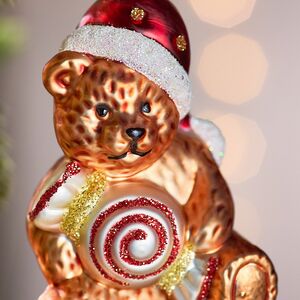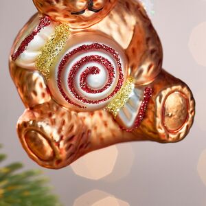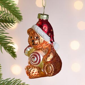 Вешать стеклянные игрушки на елку - настоящее удовольствие. Есть время в мельчайших деталях рассмотреть забавные фигурки, полюбоваться игрой света в ложбинках и на выступах, ощутить кончиками пальцев гладкость стекла елочной игрушки. И как следует проникнуться атмосферой наступающего праздника, которая буквально окутывает Мишку, натянувшего новогодний колпачок и сжимающего в лапах гигантскую конфету.