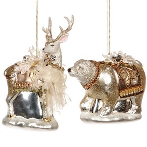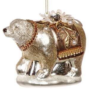 Если в глубине сказочного леса слышен треск сухих сучьев, значит, на прогулку по своим владениям вышел благородный Медведь Шамберт. Его голова с почтительным интересом осматривает родные края даже в стужу и белоснежную метель, ведь роскошная попона оберегает волшебного короля от любой непогоды. Украшенная невесомым кружевом и сияющими пайетками, она не дает отвести очарованный взгляд от дивного медведя. Повесьте стеклянную новогоднюю игрушку на елку, смотреться будет невообразимо празднично.