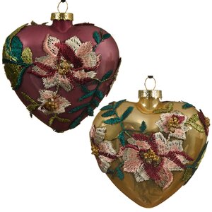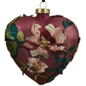 Чтобы украсить стеклянное сердце на елку летними красками, мастера рождественского декора выбрали очень креативный способ - имитацию вышивки. Изящные узоры напоминают пышно цветущие сады солнечной Италии, а нежный розовый оттенок матовой глади вызывает в душе радость и предвкушение торжества. Позвольте себе мысленно перенестись в дивное место, где исполняются желания, а жизнь пестрит только яркими красками.