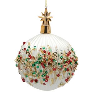 Стеклянная елочная игрушка Cielo Stellato станет жемчужиной коллекции редкого новогоднего декора! Композиция из бисера и пайеток эффектно контрастирует на фоне белоснежного рифленого стекла, создавая ощущение, что стеклянной сферы коснулась палочка лесной феи. Отдельная заслуга изящества елочного украшения - золотистый колпачок со звездой, вносящий и в без того ослепительный дизайн чарующий рождественский штрих.