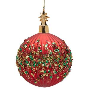 Стеклянная елочная игрушка Cielo Stellato станет жемчужиной коллекции редкого новогоднего декора! Композиция из бисера и пайеток эффектно контрастирует на фоне красного рифленого стекла, создавая ощущение, что стеклянной сферы коснулась палочка лесной феи. Отдельная заслуга изящества елочного украшения - золотистый колпачок со звездой, вносящий и в без того ослепительный дизайн чарующий рождественский штрих.