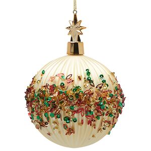Стеклянная елочная игрушка Cielo Stellato станет жемчужиной коллекции редкого новогоднего декора! Композиция из бисера и пайеток эффектно контрастирует на фоне золотого рифленого стекла, создавая ощущение, что стеклянной сферы коснулась палочка лесной феи. Отдельная заслуга изящества елочного украшения - золотистый колпачок со звездой, вносящий и в без того ослепительный дизайн чарующий рождественский штрих.