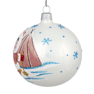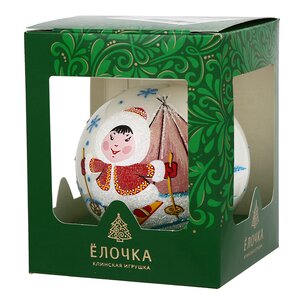 Белый елочный шар придает декору ощущение воздушности - словно кто-то скатал в комок снеговое облако, приладил сверху серебряную корону-держатель и отправил украшать праздник, радовать глаза и душу… А чтобы сделать атмосферу в доме еще веселее, мастера фабрики "Елочка" украсили белые бока игрушки забавной фигуркой мальчика Эллея в теплой меховой шубке. Вот-вот заскрипит снежок, и веселый карапуз пустится в дорогу, оставляя за собой лыжный след! Куда он торопится? Может, в тайгу за елкой?