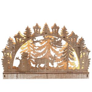 Рождественская горка светильник - восхитительный выбор декора для создания неповторимой атмосферы приближающегося Нового Года. Она выполнена из натурального дерева и передает его естественный оттенок, благодаря чему смотрится особенно уютно. Немецкие дизайнеры премиального бренда Sigro искусно проработали каждый мелкий элемент, чтобы вы могли насладиться удивительной детализацией интерьерного украшения. На округлой арке филигранно вырезан чудесный орнамент из чередующихся винтажных фонариков и миниатюрных елочек с интересной "ступенчатой" кроной. Прямо под этим сводом разворачивается прелестная сказочная сценка. По хвойному лесу, среди уходящих ввысь густых сосен, неспешно прогуливается благородный олень. Грациозное создание ступает прямо по небольшим сугробам, словно по зимней "ковровой" дорожке, и вот-вот начнет задевать ветвистыми рогами низенькие веточки. Компанию ему составляет очаровательный снеговик с доброй улыбкой и котелком на голове. Лесные жители даже не догадываются, что стоит им поднять головы - и они увидят настоящее чудо: прямо над ними в своей оленьей упряжке проносится Санта-Клаус, спеша доставить всем замечательные гостинцы к сроку. Светильник горку удобно разместить на подоконнике, комоде или декоративной полочке, а когда вы включите ее - мягкое сияние заструится из глубин деревянной инсталляции, уютно озаряя силуэты персонажей, а в вашем доме воцарится праздничное настроение и ощущение волшебства.