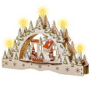 Роскошное украшение из дерева в форме моста, на котором уютно расположились многочисленные заснеженные елочки и яркие свечи-лампочки, а под полукруглым сводом – маленькие домики и фигурки ребятишек, играющих в снежки. Декор полон изящества и особенного новогоднего озорства, которое дарит интерьеру атмосферу искрометного веселья и подлинного домашнего уюта. Горят огоньки, сверкают в свете ламп кристаллики снега – праздник начинается!