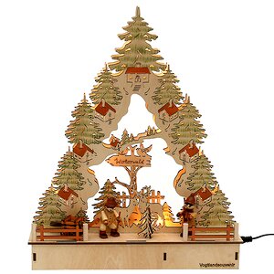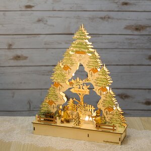 Светодиодные светильники-горки не зря пользуются огромной популярностью. Они добавляют интерьеру нотки таинственности, сказочности и романтики. Так приятно зажечь в темноте огоньки и полюбоваться их колдовским мерцанием. А когда аксессуар таит в себе интересный сюжет, то это вдвойне прекрасно. Яркий пример – светильник Зимний Лес. На резном деревянном панно изображен городок, окруженный высокими елями. Полянку облюбовала парочка благородных оленей. А ключевой персонаж истории – дровосек с тележкой, полной веточек и бревен.