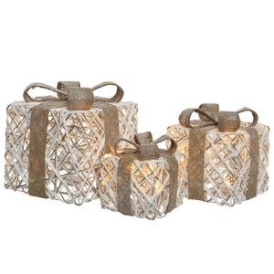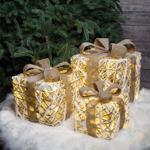 Новогодние фигуры в виде коробок с сюрпризами замечательно дополнят праздничный декор. Светящиеся подарки выглядят так, словно их сплела какая-то мастерица, слегка припорошила волшебным снежком, а внутри спрятала маленьких светлячков. Очаровательная композиция из светодиодных фигур будет здорово смотреться под елкой и поможет создать волшебную атмосферу в доме.