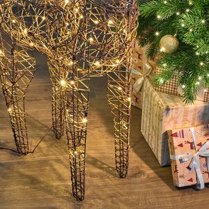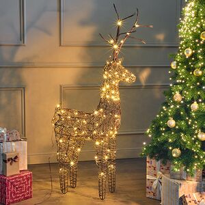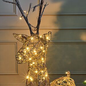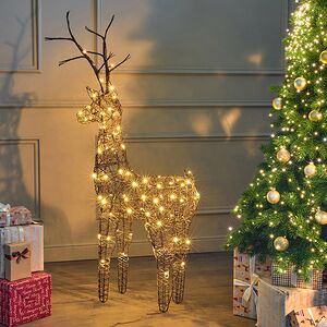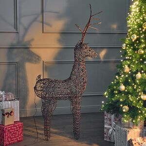 Светодиодный Олень, сплетенный из проволоки элегантного орехового цвета, твердо намерен придать вашему празднику немного лоска. Этот рогатый джентльмен так хорош, что рядом с ним стал бы выглядеть благороднее даже кактус, не говоря уже о лесной красавице, украшенной мишурой и игрушками! Стоя где-нибудь на видном месте, домашний или, по вашему желанию, уличный светящийся Олень от мастеров Kaemingk сделает чуточку наряднее и дороже всю окружающую обстановку. А на какие чудесные мечты вдохновит вас его сияющая 135 крупными лампочками фигурка!