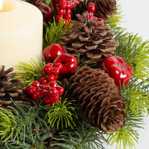Венок для свечи Apple Berry идеально передает настроение праздника благодаря сочетанию зелени пышных литых веток с ярко-красными ягодами и яблоками. Лесные шишки дополняют композицию, подчеркивая натуралистичный дизайн украшения. Идеально подходит для украшения столов, каминов или дверных косяков в преддверии осени и зимних праздников.