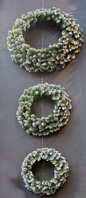 Венки большого диаметра также могут использоваться в качестве потолочных хвойных люстр. Вы можете создавать неповторимые стильные композиции, используя весь арсенал новогоднего декора — рождественский венок, украшенный бусами, лентами, шарами и гирляндами, превращается в уникальное дизайнерское украшение.
