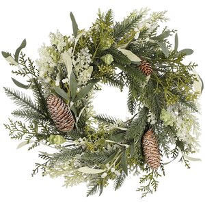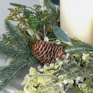 Еловый венок Alva - новогоднее украшение для свечи, разрушающее все стереотипы о новогодних венках. Кто бы мог подумать, что кроме елочной хвои и шишек в этом праздничном декоре будут так гармонично смотреться изящные веточки туи, зеленые луговые листья и белоснежные цветы! Это чудесный вариант для тех, кому надоели традиционные венки из еловых веток.