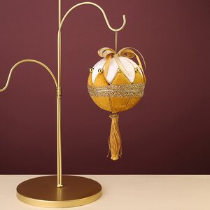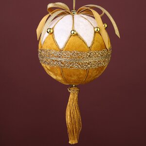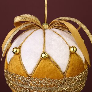 Элегантный елочный шар с декором из ткани выглядит роскошнее, чем придворный вельможа. Как тонко сочетаются в его наряде изысканная белизна первого снега и сияющее золото! Какую легкость придают новогоднему винтажному шару кружевная вязь на боках и мягкий атласный блеск шапочки! И как задорно будет топорщиться кокетливый батик и покачиваться мохнатая кисточка, когда вы повесите шар на елку!